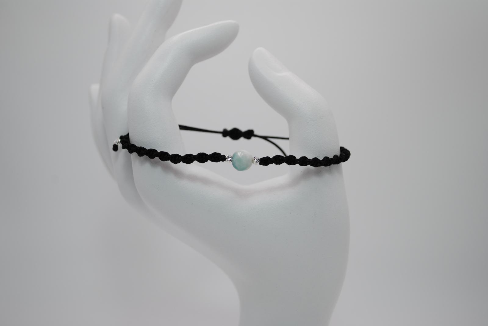 Această brățară este lucrată manual cu migală, din snur negru de 0,8 mm de înaltă calitate, împletit în mod spiralat, pentru un efect vizual fluid și elegant. Este decorată cu pietre naturale semiprețioase amazonit fațetate de 6 mm, cunoscute pentru nuanțele lor blânde și energia calmantă, și biluțe din argint 925 de 2,5 mm, care adaugă un accent rafinat.