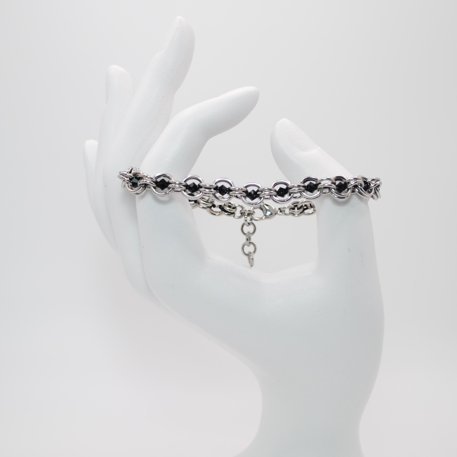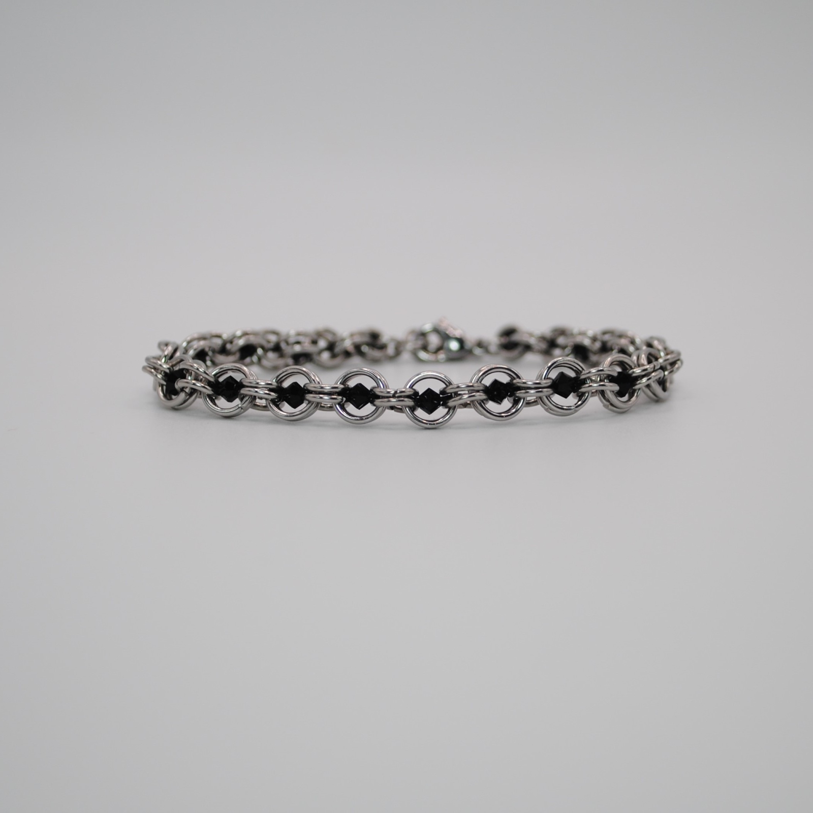 Brățara Black Glow este o piesă statement, lucrată manual cu migală din zale de 5, 6 și 7 mm, fiecare închisă individual și împletită cu precizie într-un model unic, durabil și vizual hipnotizant. Între ansamblurile metalice, cristalele biconice Preciosa de 3 mm, în nuanță neagră intensă, par să plutească subtil — oferind un contrast misterios și sofisticat care atrage privirea fără ostentație.