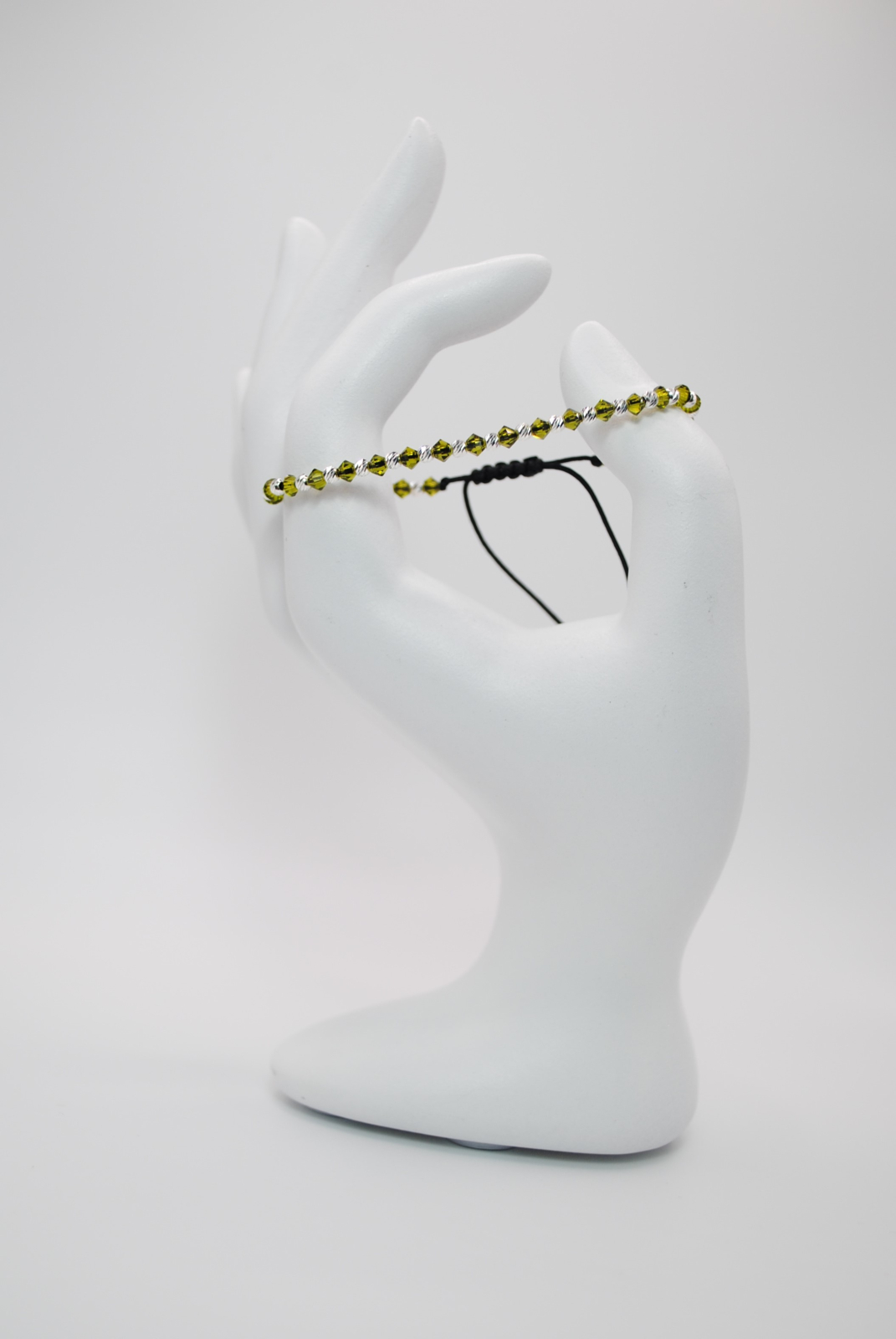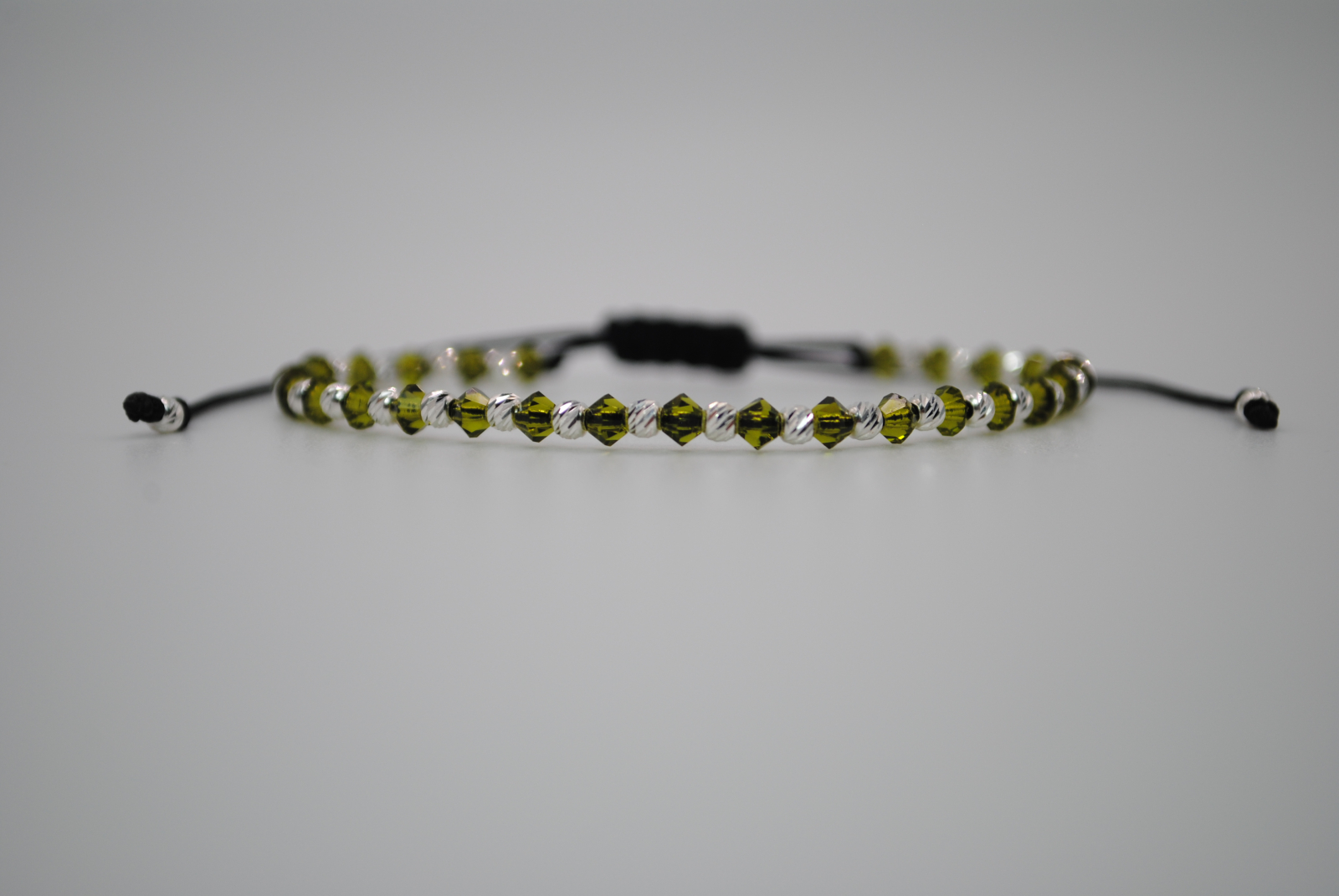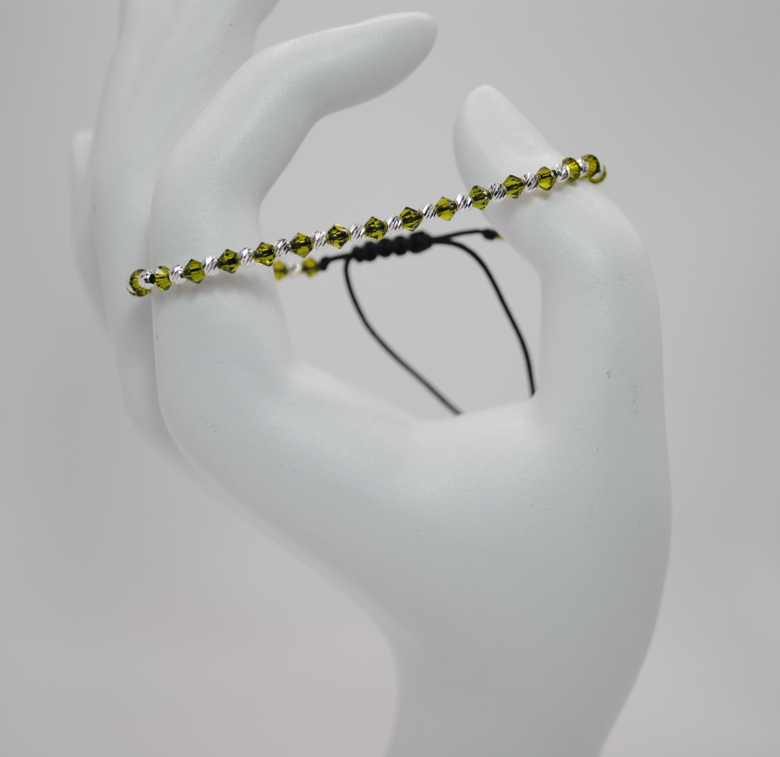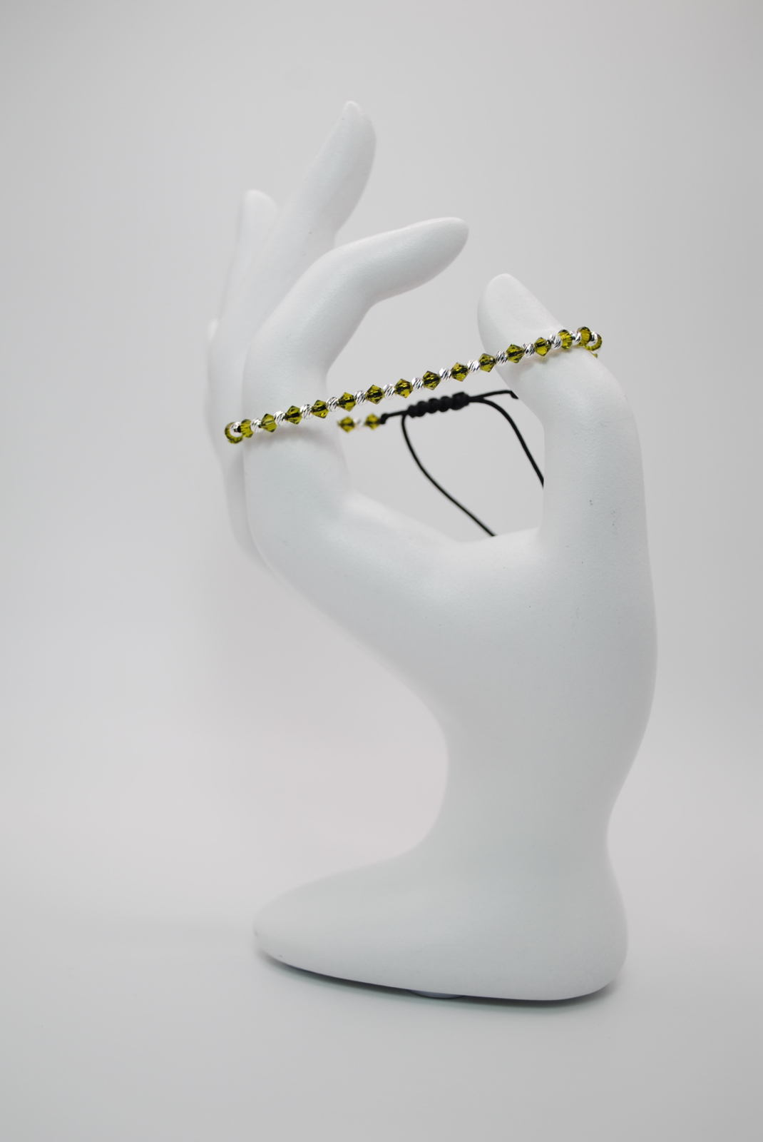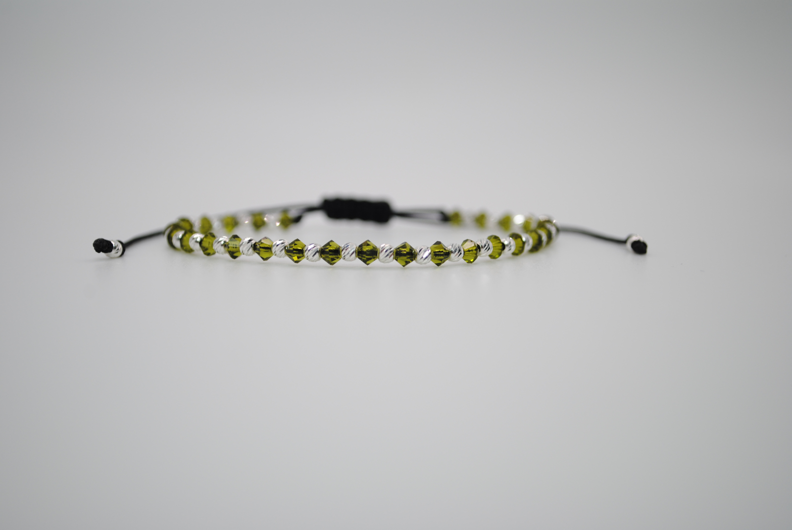 Această brățară este realizată manual, din snur negru de 0,8 mm, împletit cu grijă pentru durabilitate și confort. Este decorată cu cristale biconice Preciosa de 3 mm în nuanța olivine, o culoare subtilă și naturală ce evocă prospețime și echilibru, completate de biluțe din argint 925 de 2,5 mm, care adaugă o notă de strălucire discretă.