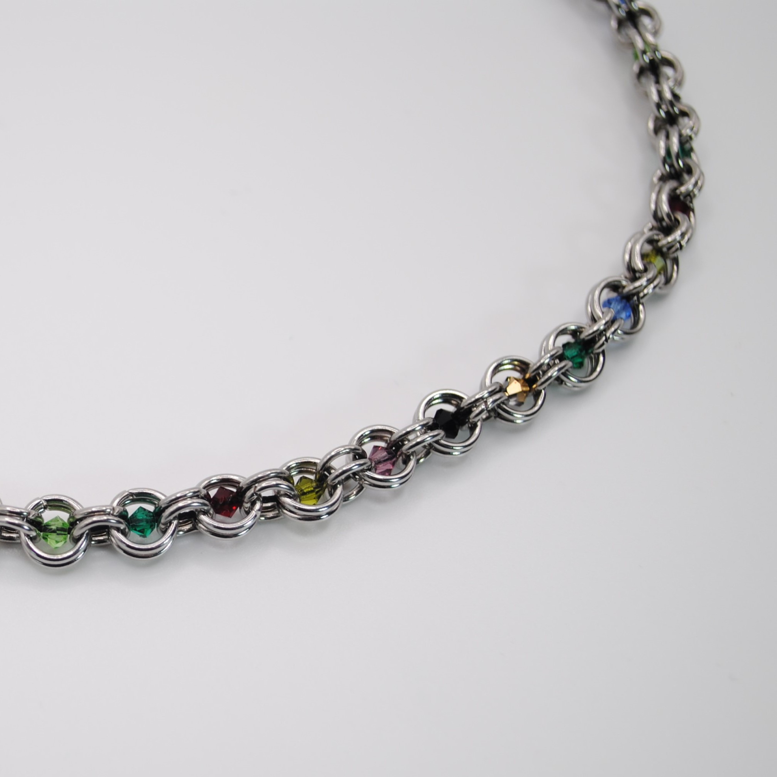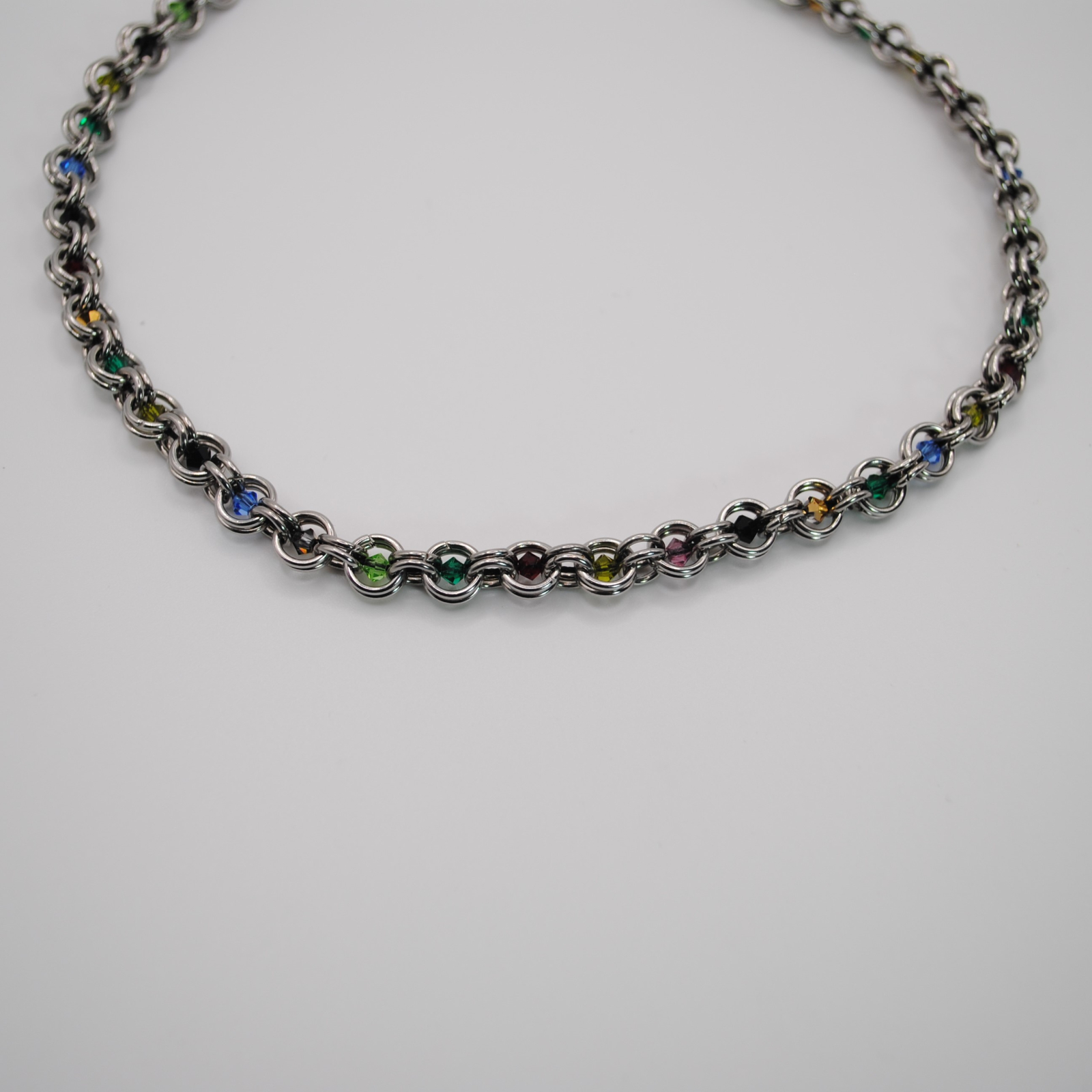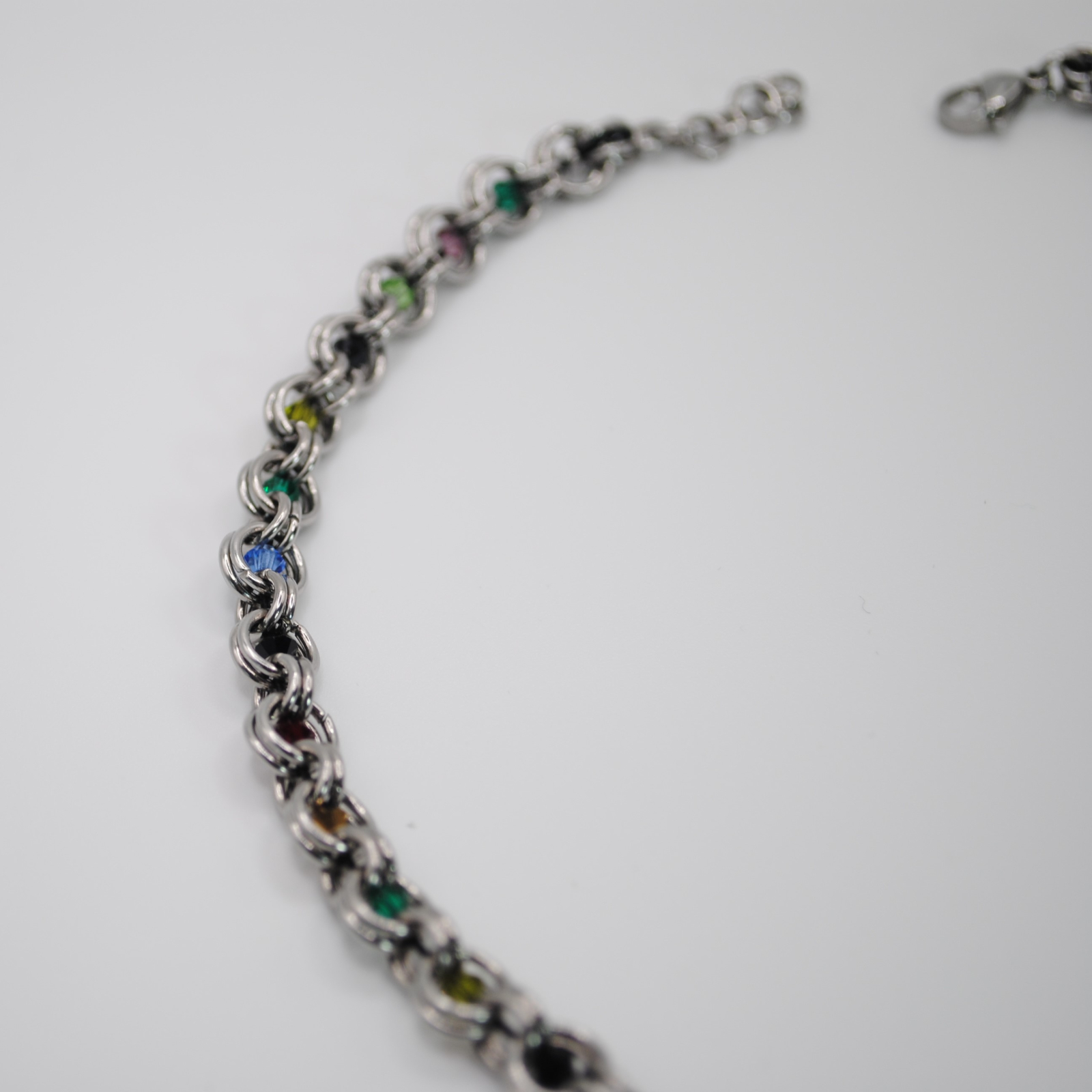 Colierul Rainbow este o bijuterie artizanală creată cu o atenție deosebită pentru detalii, un accesoriu care îmbină tehnica tradițională chainmaille cu eleganța modernă a cristalelor Preciosa. Fiecare za din oțel inoxidabil de 5, 6 și 7 mm este închisă manual și atașată individual, formând o împletitură complexă, rezistentă și spectaculoasă. Această tehnică, folosită de artizani din întreaga lume, transformă un simplu lanț într-o piesă de design sofisticată, cu personalitate și durabilitate remarcabilă.