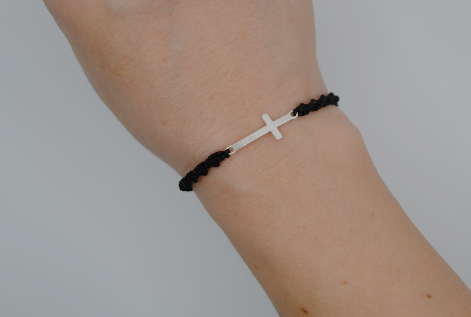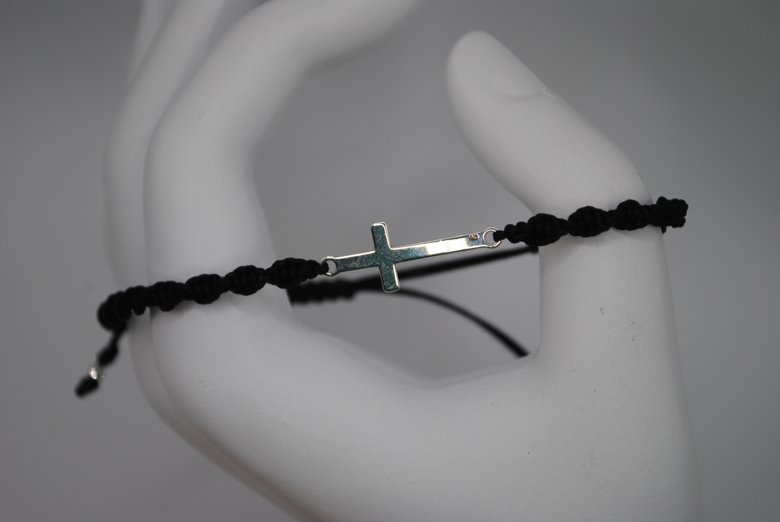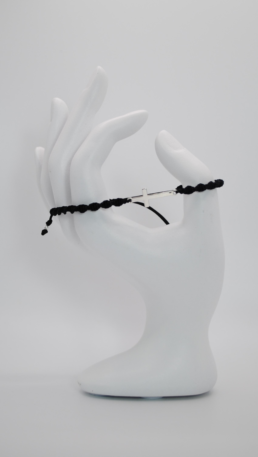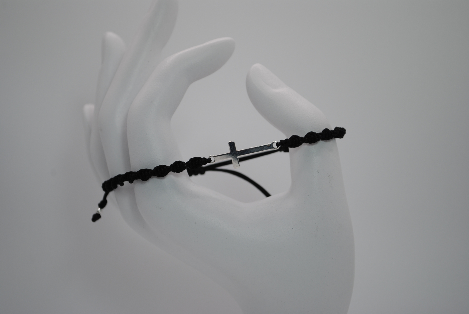 Această brățară este realizată manual, din snur negru de 0,8 mm, împletit în mod spiralat, oferind un efect vizual fluid și rafinat. În centrul compoziției se află o cruciuță din argint 925, simbol al protecției și credinței, flancată de biluțe fine din argint 925 de 2,5 mm, care adaugă un contrast subtil și elegant.