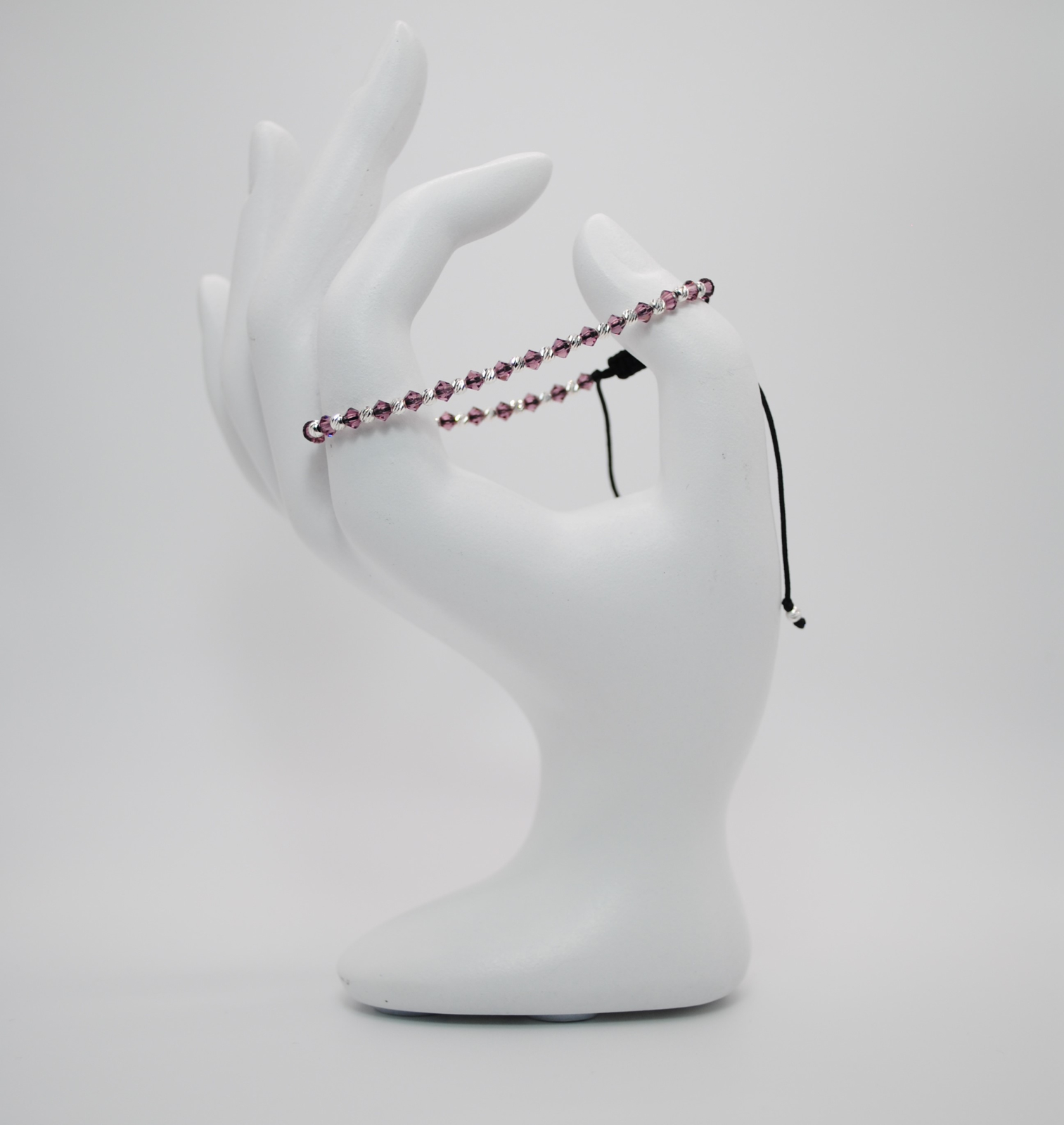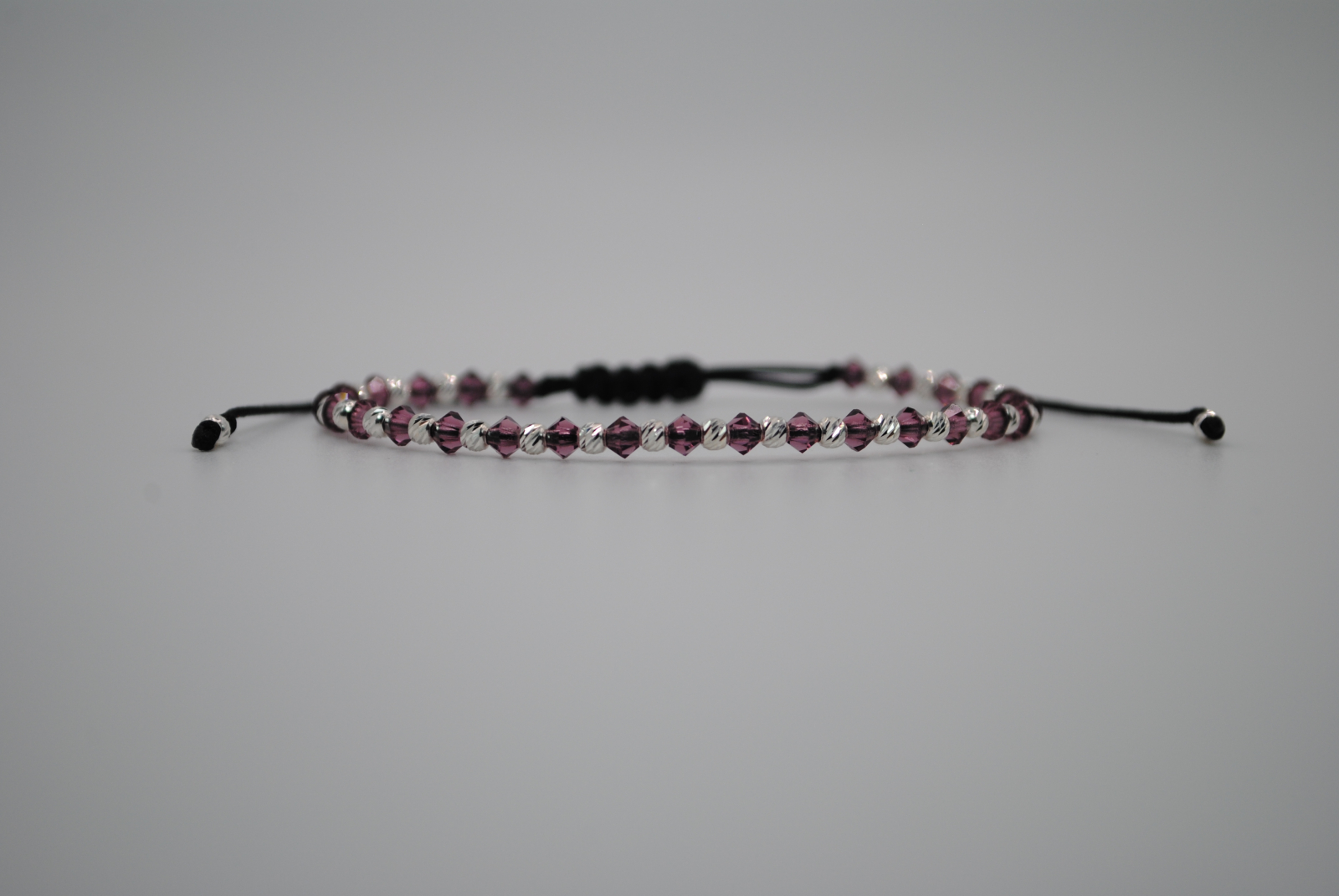 Această brățară este realizată manual, din snur negru de înaltă calitate, împletit cu grijă pentru confort și durabilitate. Este decorată cu cristale biconice Preciosa de 3 mm în nuanța ametist, o culoare asociată cu echilibrul, feminitatea și rafinamentul, completate de biluțe din argint 925 de 2,5 mm, care adaugă un accent strălucitor și elegant.
