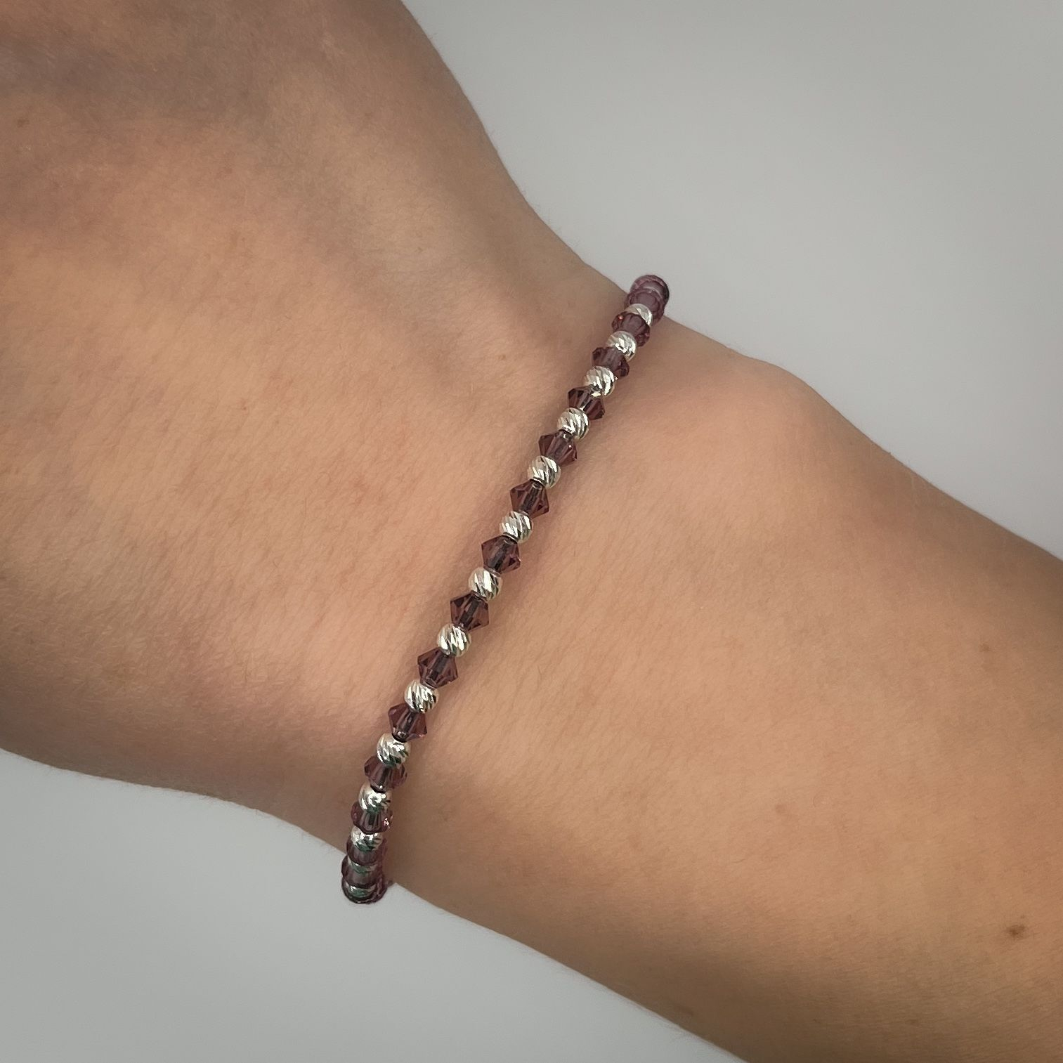 Brățara Purple Gabrieli este o bijuterie handmade realizată din șnur negru de înaltă calitate, decorată cu cristale biconice Preciosa de 3 mm în nuanța ametist și biluțe din argint 925 de 2,5 mm. Nuanța mov intens evocă echilibrul, feminitatea și rafinamentul, iar argintul adaugă o strălucire discretă și elegantă.