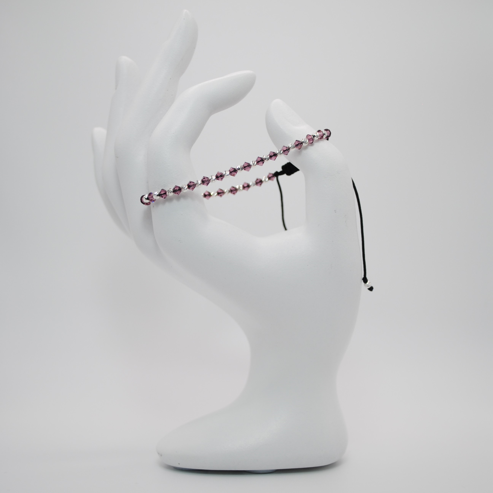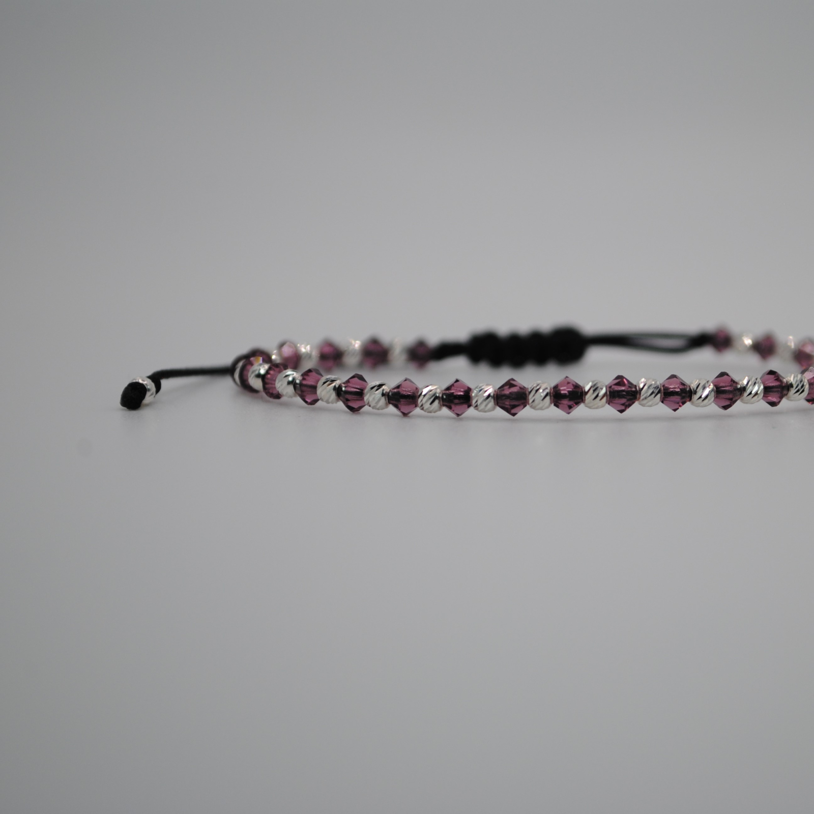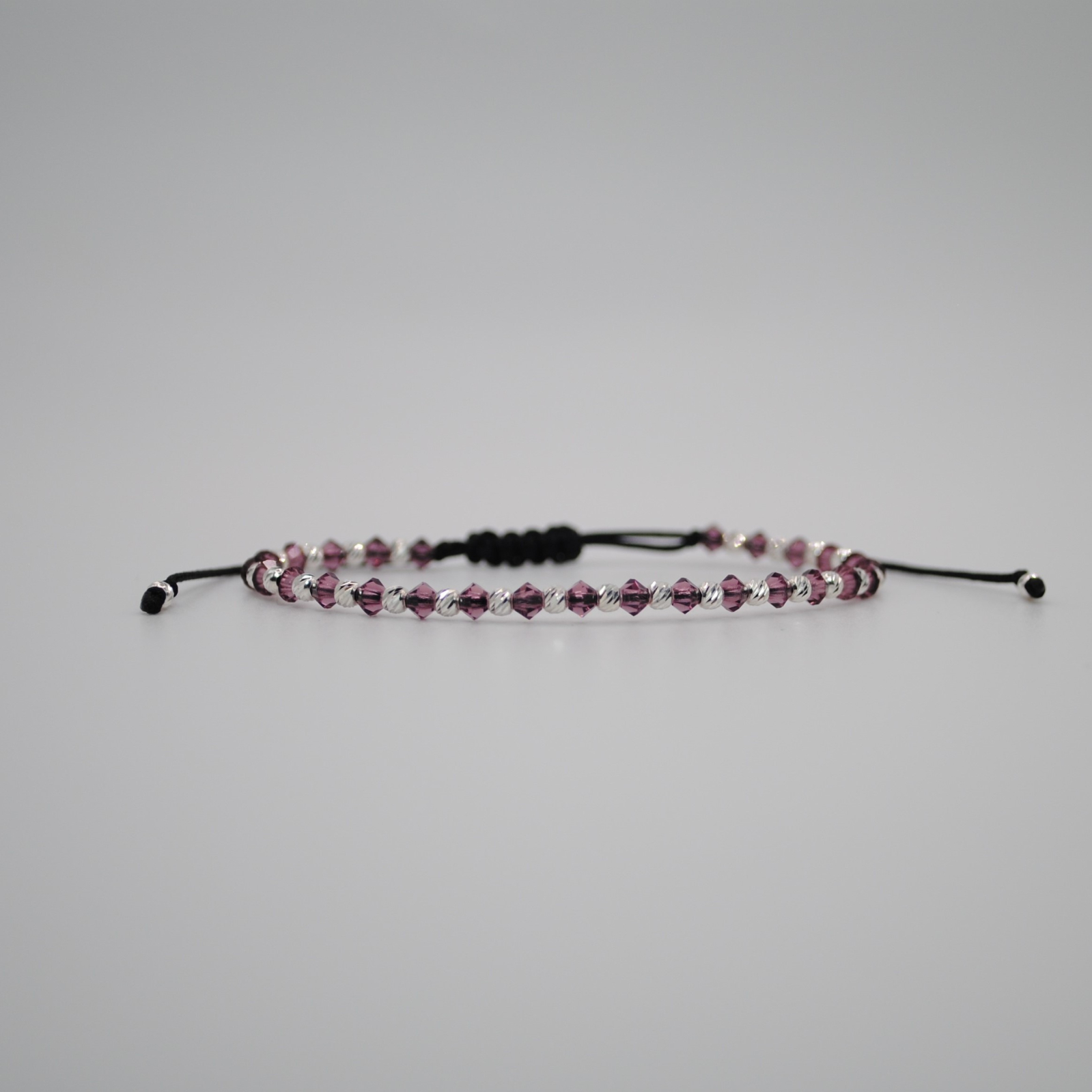 Brățara este realizată din șnur negru de înaltă calitate, cristale Preciosa Ametist de 3 mm și biluțe din argint 925 de 2,5 mm.