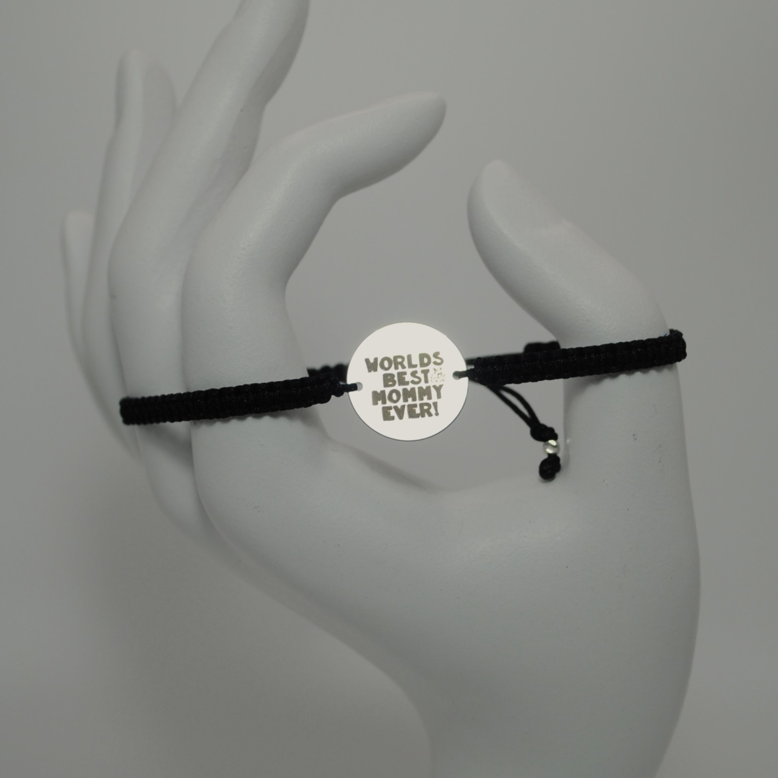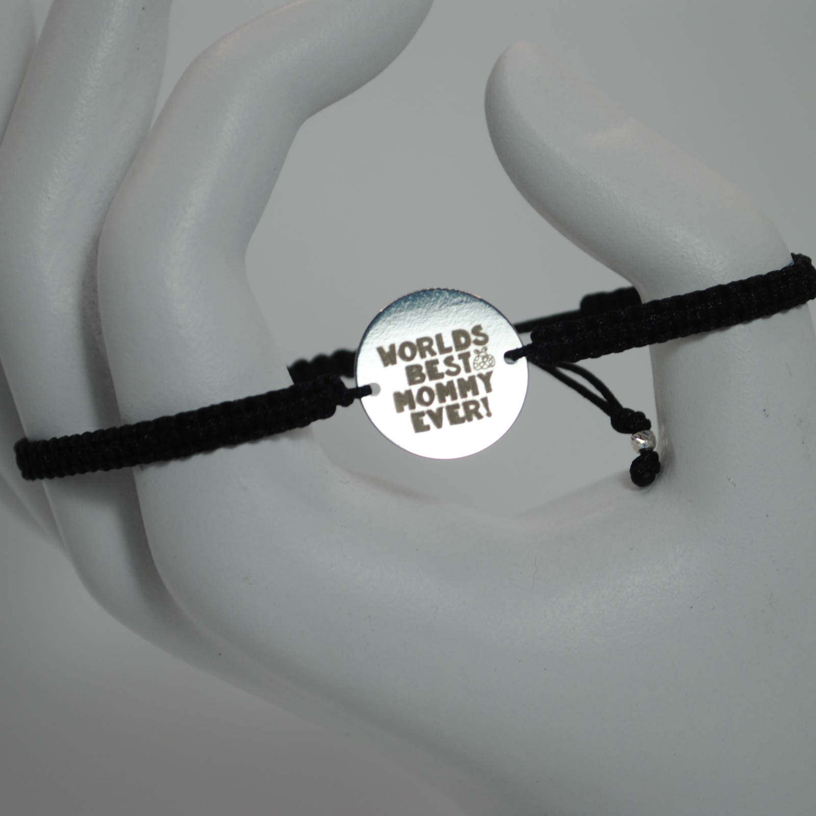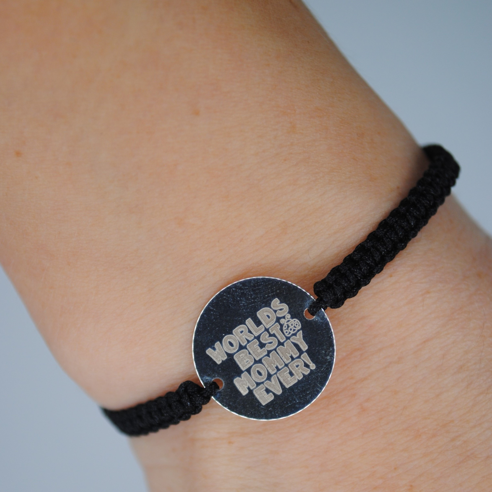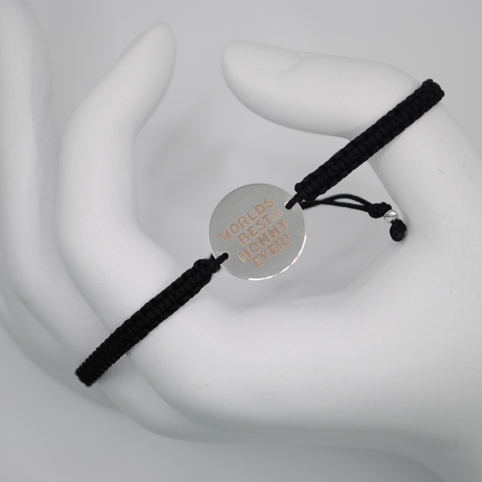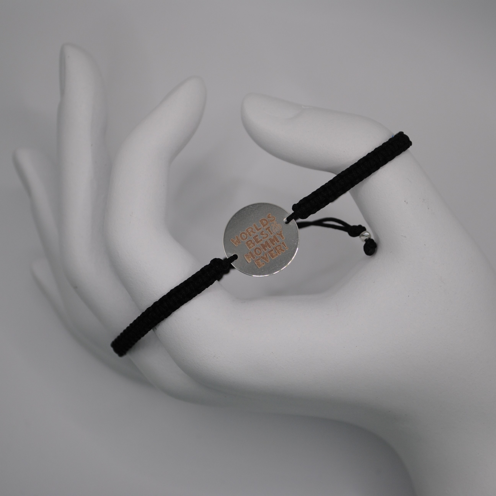Brățara este realizată din snur negru de 0,8 mm, biluțe din argint 925 de 2,5 mm și un bănuț central din argint 925 gravat cu mesajul „World’s Best Mommy Ever”.