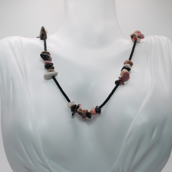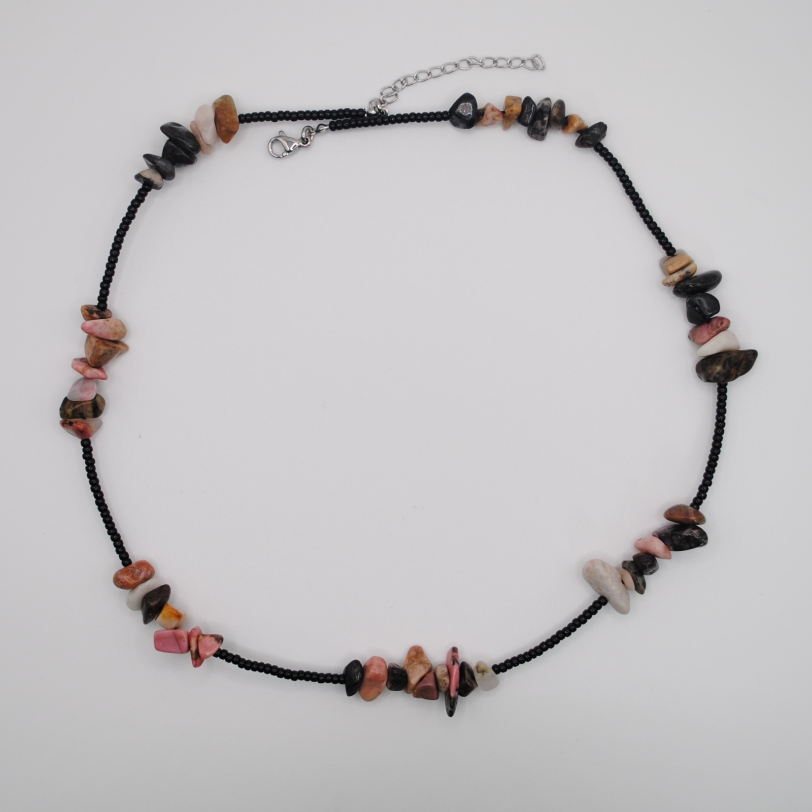 Colierul Gabrieli cu rodonit este o bijuterie handmade realizată cu atenție la fiecare detaliu, din cipsuri autentice de rodonit și mărgele Miyuki negre. Fiecare piatră naturală are nuanțe unice de roz, gri și negru, oferind colierului un aspect organic, elegant și ușor de integrat în orice stil vestimentar.