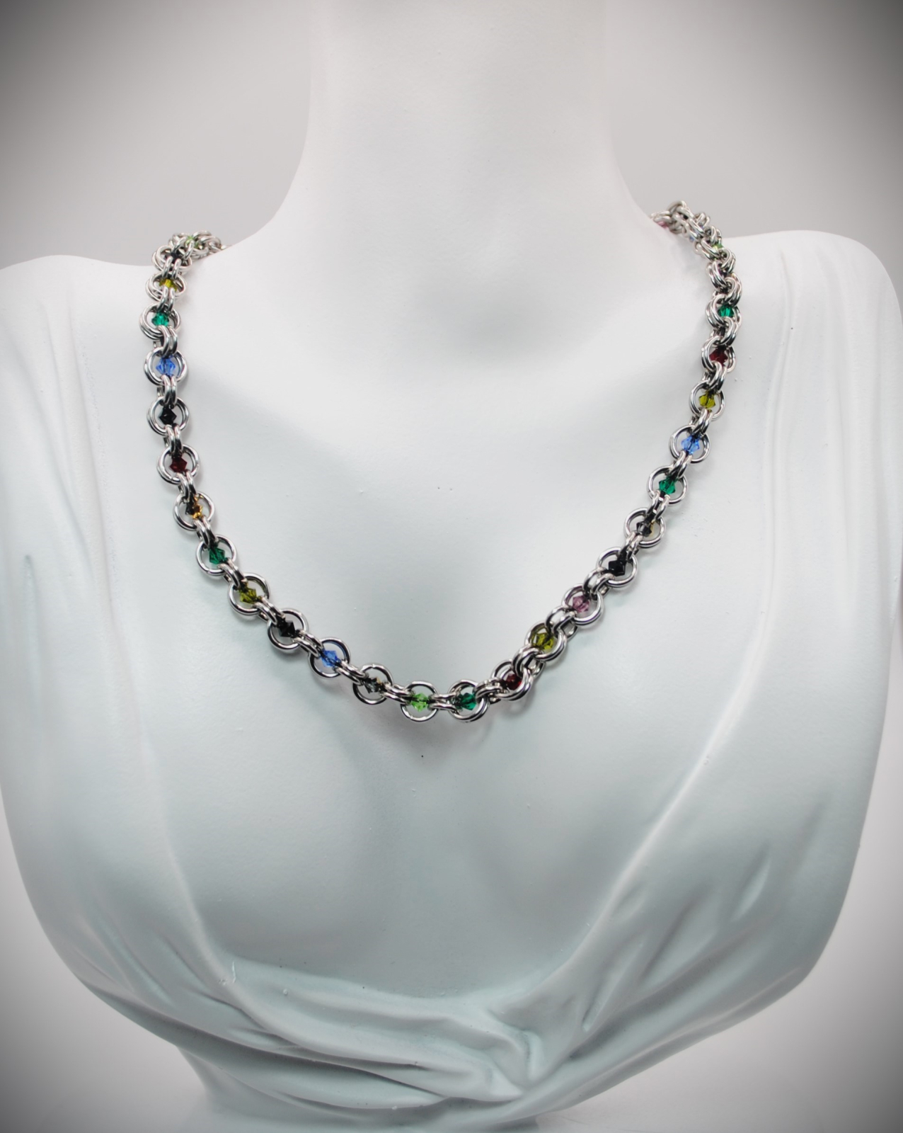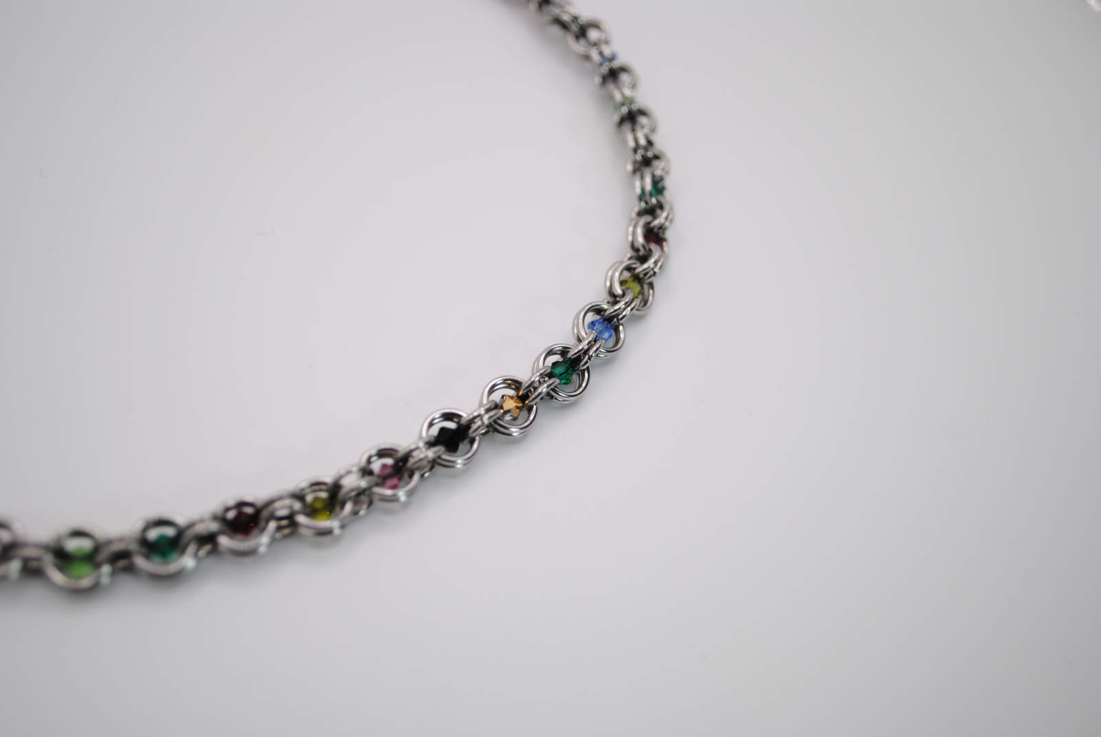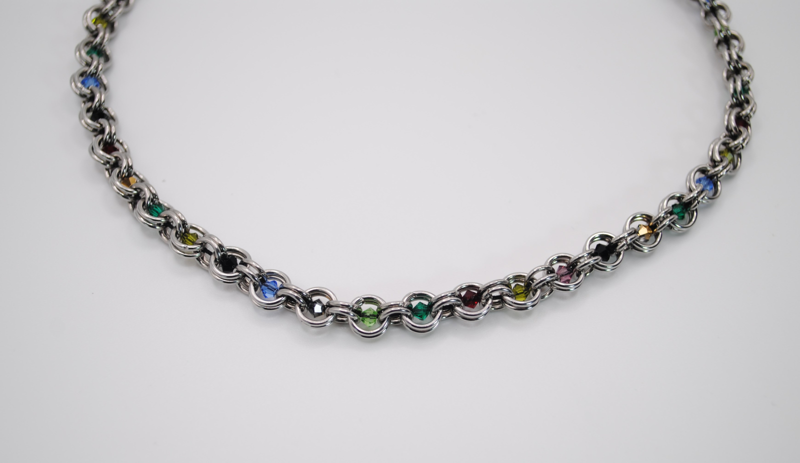 Colierul Rainbow este o bijuterie artizanală realizată cu migală, unde fiecare za din oțel inoxidabil de 5, 6 și 7 mm este închisă manual și atașată de următoarea, formând o împletitură complexă ce se transformă într-un lanț elegant și rezistent. Tehnica chainmaille folosită conferă colierului un aspect sofisticat, dar și o durabilitate aparte.