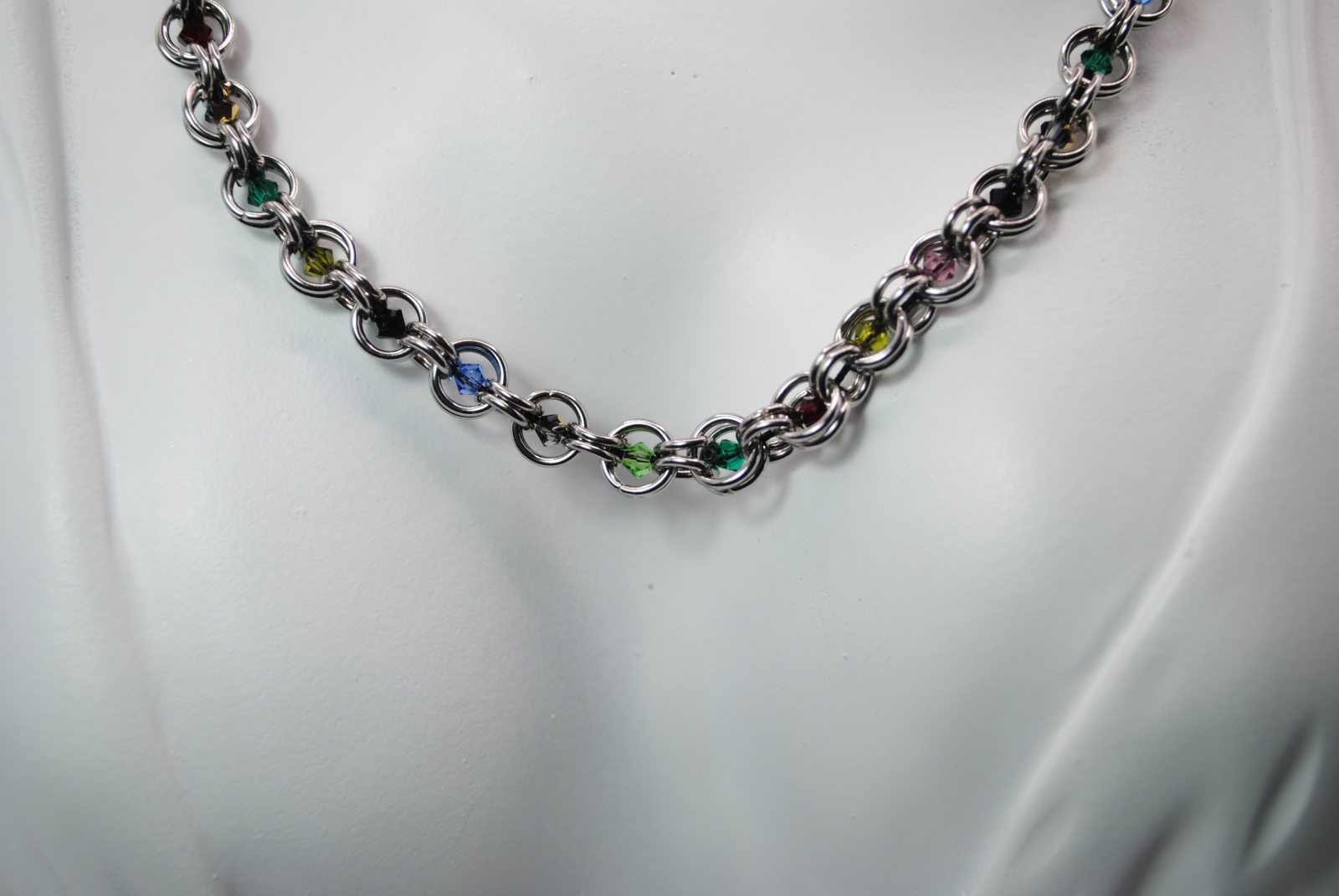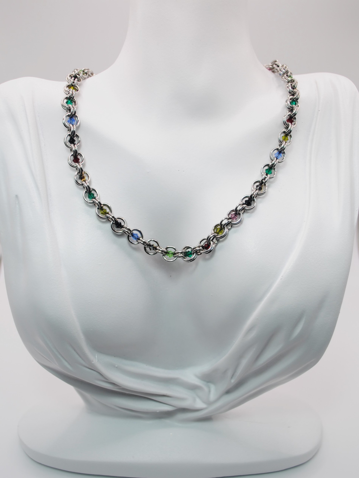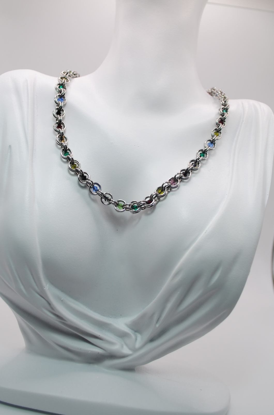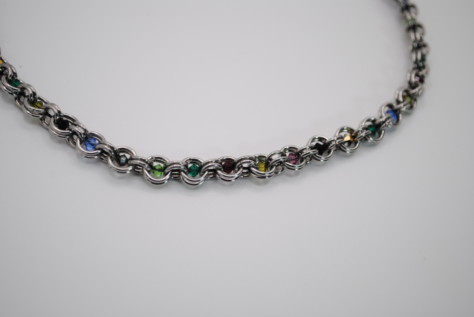 Colierul Rainbow este o bijuterie artizanală realizată cu migală, unde fiecare za din oțel inoxidabil de 5, 6 și 7 mm este închisă manual și atașată de următoarea, formând o împletitură complexă ce se transformă într-un lanț elegant și rezistent. Tehnica chainmaille folosită conferă colierului un aspect sofisticat, dar și o durabilitate aparte.